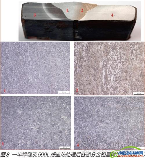 如图8所示,焊接接头可根据母材及其组织将热处理过的焊接接头分为1区、2区、3区和4区。具体金相显微组织为:焊缝组织1区为贝氏体 针条铁素体 少量马氏体,焊缝组织2区为马氏体 贝氏体,母材45钢板材3区组织为回火索氏体 少量黑色屈氏体团,母材590L板材4区组织为回火马氏体 铁素体。通过表7中试样的抗拉强度值及图8中的金相显微组织可以得出:从焊缝一半位置起对母材590L进行感应热处理这种局部热处理提供高强度的方法可行,热处理后焊接试样的整体抗拉强度达到975MPa,相对于热处理之前的635MPa提高了340MPa,强度提高了53.5%,达到了设计技术要求,能够满足实际需求。