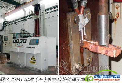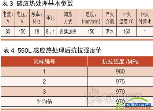 由于此力学值不能达到实际生产要求,如欲达到要求就要采用更高强度板材或者增加板材的厚度,这就意味着增加成本和提高零件的自重,但在轻量化和降成本的大环境下这是不可行的。因此,退而求其次对强度低的板材即590L板材采用感应热处理的方式进行精确热处理,以提高焊接后板材的整体强度。