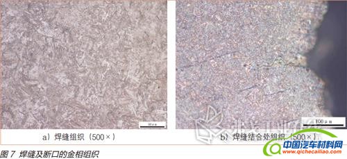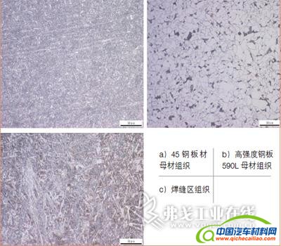 经过金相检验分析,45钢板材母材组织为带位向的回火索氏体,而高强度钢板590L母材组织为铁素体 珠光体,焊缝区组织为针状铁素体 贝氏体 少量马氏体。此金相组织与其强度相一致,金相组织正常。