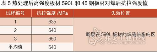 由于对整个焊缝进行热处理,最终出现异常情况,所以为防止上述情况的发生,仅对低强度板材590L及结合的焊缝一半位置进行热处理,热处理后测得板材的抗拉强度如表7所示。