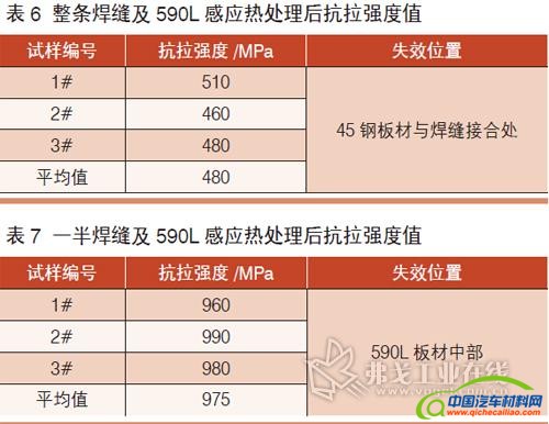 针对高强度板材590L与45钢板材的焊接及感应热处理进行工艺试验,通过对比不同工艺下试样的抗拉强度数据,分析试样失效部位的显微组织,我们最终得出了提高焊接板材强度的有效方法。具体如下: