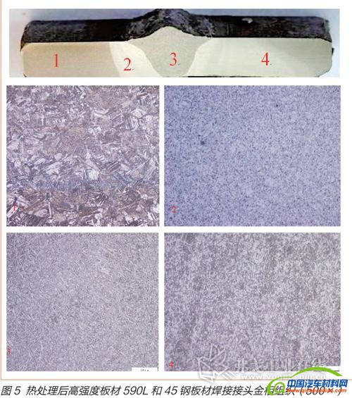 对拉断的试样进行金相分析,图5为热处理后高强度板材590L和45钢板材焊接接头,1区为590母材,2区为590母材焊后热影响区,3区为焊缝,4区为45钢板材母材;焊接接头金相显微组织,其中1区590L母材基体组织为板条马氏体 少量铁素体,2区590母材焊后热影响区组织为铁素体 珠光体,3区焊缝组织针状铁素体 贝氏体 少量马氏体,4区45钢板材母材组织为铁素体 回火索氏体。