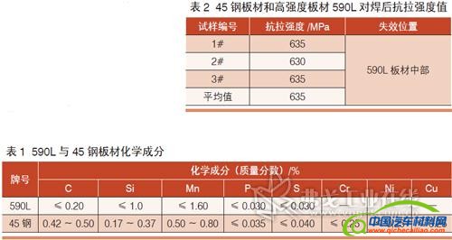 高强度板材590L直接从厂家轧制取材,属于高强度钢板系列的低碳钢,最小抗拉强度为590MPa,各项性能指标参照GB/T3273-2005;而45钢板材经过整体调质,其硬度为30~32HRC,抗拉强度1000~1050MPa。590L与45钢板材化学成分如表1所示。