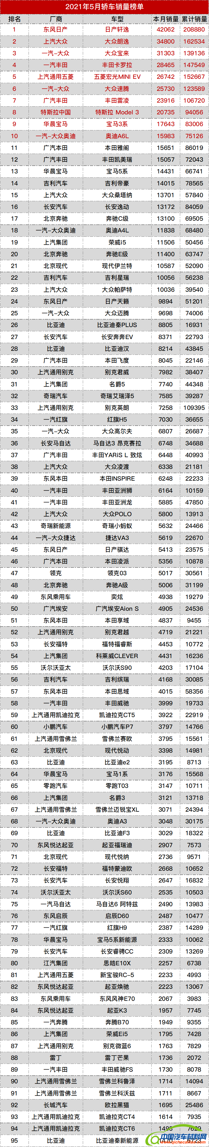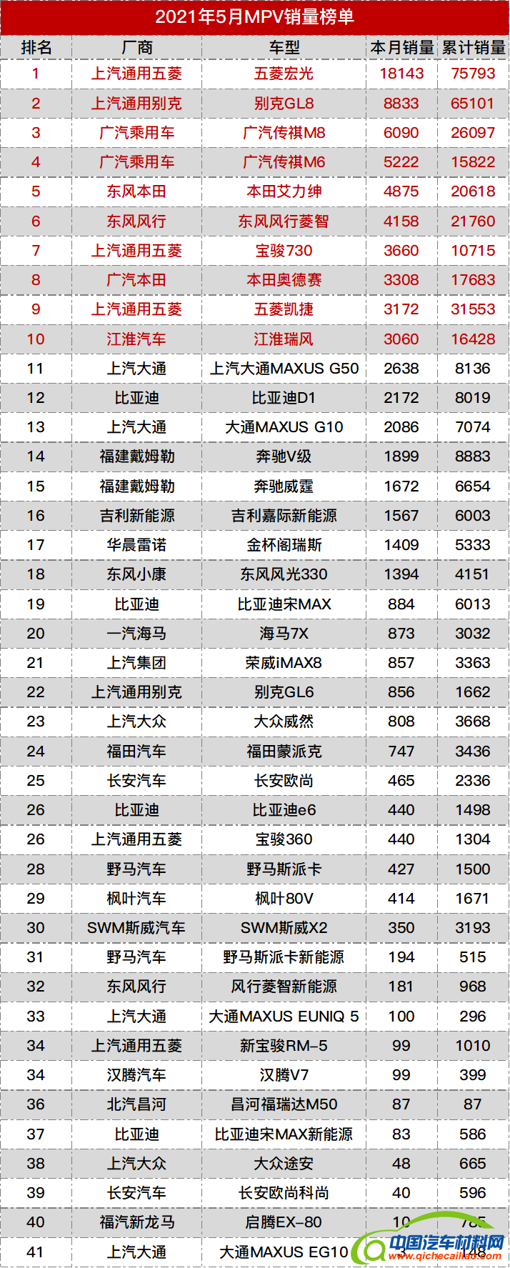 2021年5月MPV销量榜:1.五菱宏光 18143辆;2.别克GL8 8833辆;3.广汽传祺M8 6090辆;4.广汽传祺M6 5222辆;5.本田艾力绅 4875辆;6.东风风行菱智 4158辆;7.宝骏730 3660辆;8.本田奥德赛 3308辆;9.五菱凯捷 3172辆;10.江淮瑞风 3060辆;