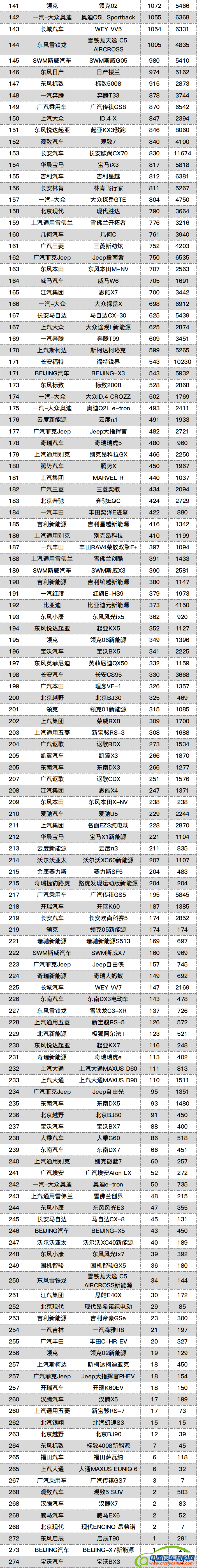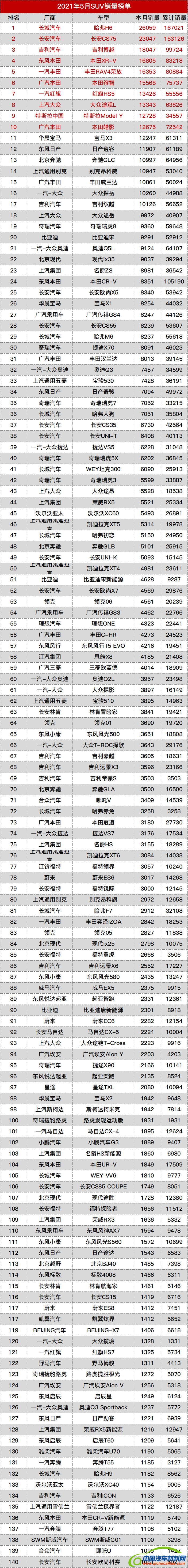 2021年5月SUV销量总榜:1.哈弗H6 26059辆;2.长安CS75 23047辆;3.吉利博越 18047辆;4.本田XR-V 16805辆;5.丰田RAV4荣放 16353辆;6.本田缤智 15568辆;7.红旗HS5 13426辆;8.大众途观L 13343辆;9.特斯拉Model Y 12728辆;10.本田皓影 12675辆;