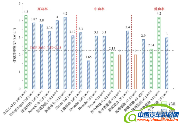 双极板是PEMFC电堆的重要组件,约占整体70%的质量和30%的价格。根据双极板材料的不同可以分为石墨双极板、金属双极板和复合双极板。石墨及其复合材料脆性大、渗气性高、成本较高;相比之下,金属双极板强度更高,具有更好的成形性、抗冲击性和较低的渗气性。图2整理了部分国内外制造商的车用PEMFC电堆的体积功率密度及其双极板类型。根据适用的车型和功率不同,可将PEMFC电堆分为高功率、中功率、低功率3类。