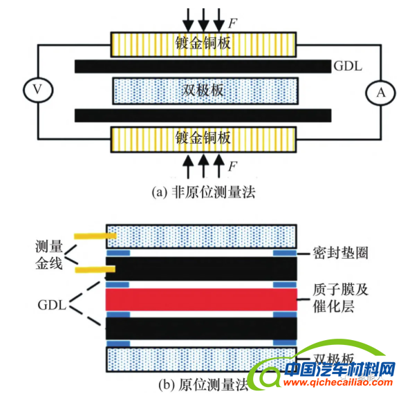 原位测量法如图3b所示,将一根测量金线与双极板焊接在一起,另外一根测量金线插入气体扩散层(GDL)中,在PEMFC工作过程中测量相应的电压和电流,由下式可求得金属双极板的ICR。