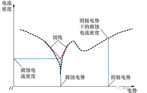 较低的腐蚀电流密度和较高的腐蚀电势表明金属双极板具有良好的耐蚀性。将打磨好的样品作为工作电极,置于酸性环境中,采用电化学工作站,利用动电位(常用扫描速率为1mV/s)能够得到如图4所示的极化曲线,可以测定腐蚀电势,并通过外推得到腐蚀电流密度。