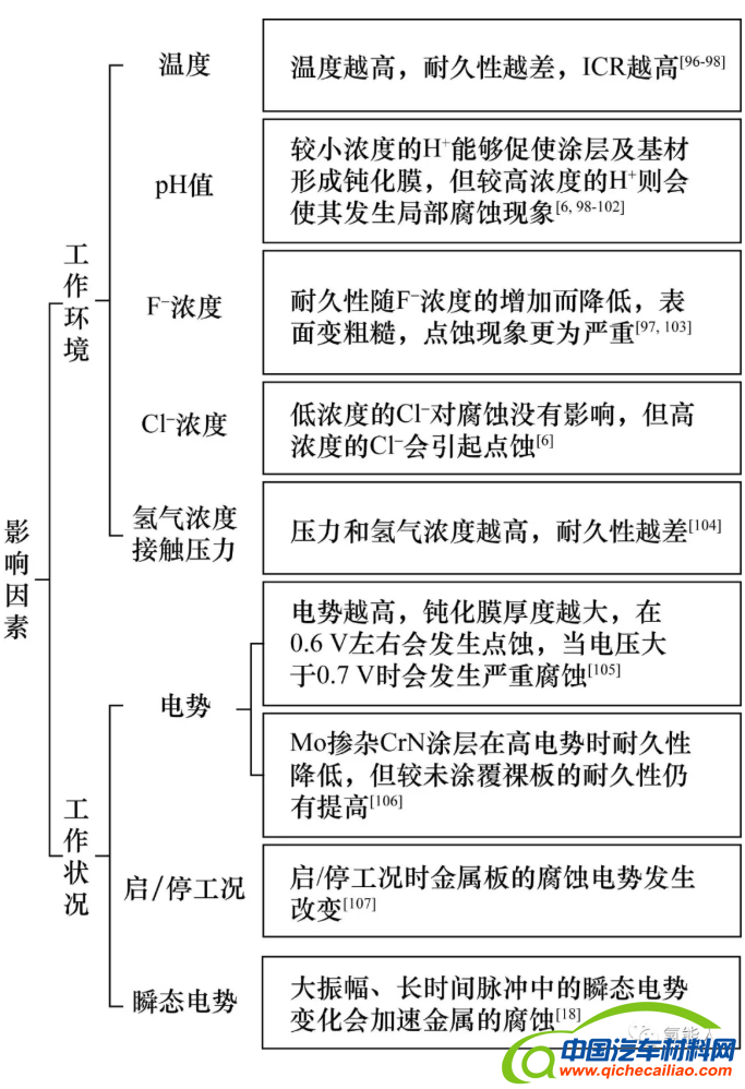 金属双极板及其涂层导电性与耐久性影响因素通过对相关文献的整理,归纳了工作环境和工作状况对金属双极板及其涂层耐久性的影响因素: