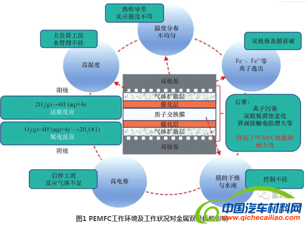 (1)由于材料老化和控制策略不佳,使PEMFC的工作环境发生了变化,如温度、双极板表面液态水的pH值、水中阴离子浓度变化等。