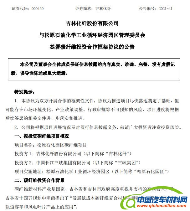 吉林化纤表示,碳纤维是吉林市优势产业,公司作为吉林市唯一的国有控股上市公司,投资碳纤维产业符合公司发展战略,是公司打造全球最具影响力的纤维产品制造商和新型材料供应商的必由之路,吉林化纤正致力于碳纤维产业链一体化发展,逐步成长为具备碳纤维及其制品的研发、生产、销售的全产业链企业。