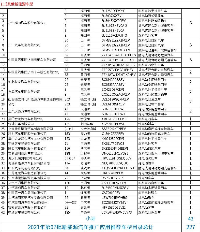 2)其他新能源车型共有28家企业42个车型,其中纯电动产品共15家企业17个型号、燃料电池产品12家企业18个型号、插电式混合动力产品4家企业7个型号。