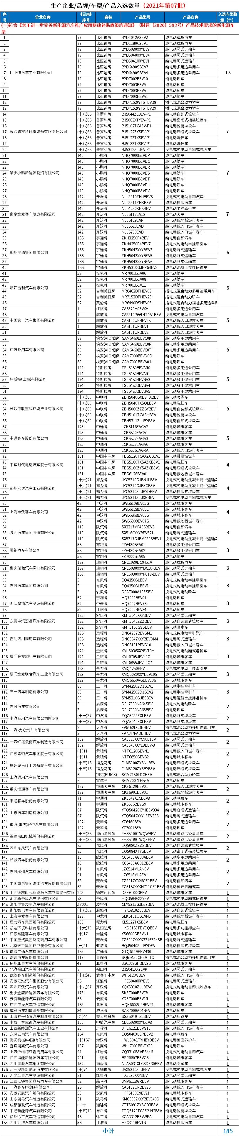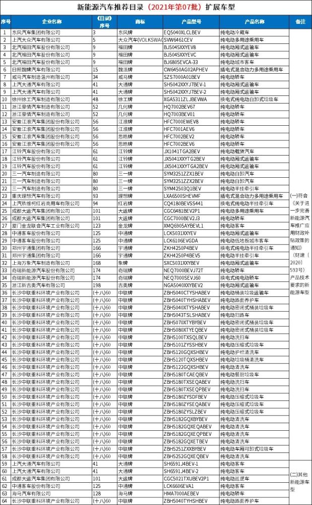 2021年第07批新能源汽车推广应用推荐车型目录变更扩展车型64个。