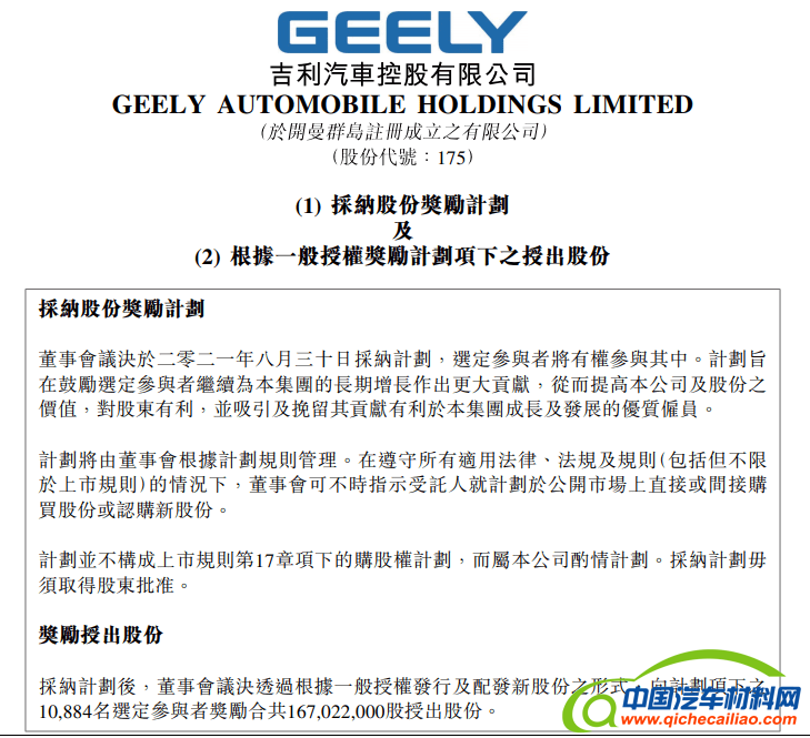 【汽车材料网】8月30日,吉利共同富裕计划细则发布,吉利汽车(HK.0175)董事会共批准3.5亿股额度,第一批向一万多名员工授予其中1.67亿股,按照吉利汽车按当日收盘价计算,市值约为45亿港币。后续根据员工入职和晋升发展等情况,继续实行股份奖励计划,让更多员工分享企业发展成果。
