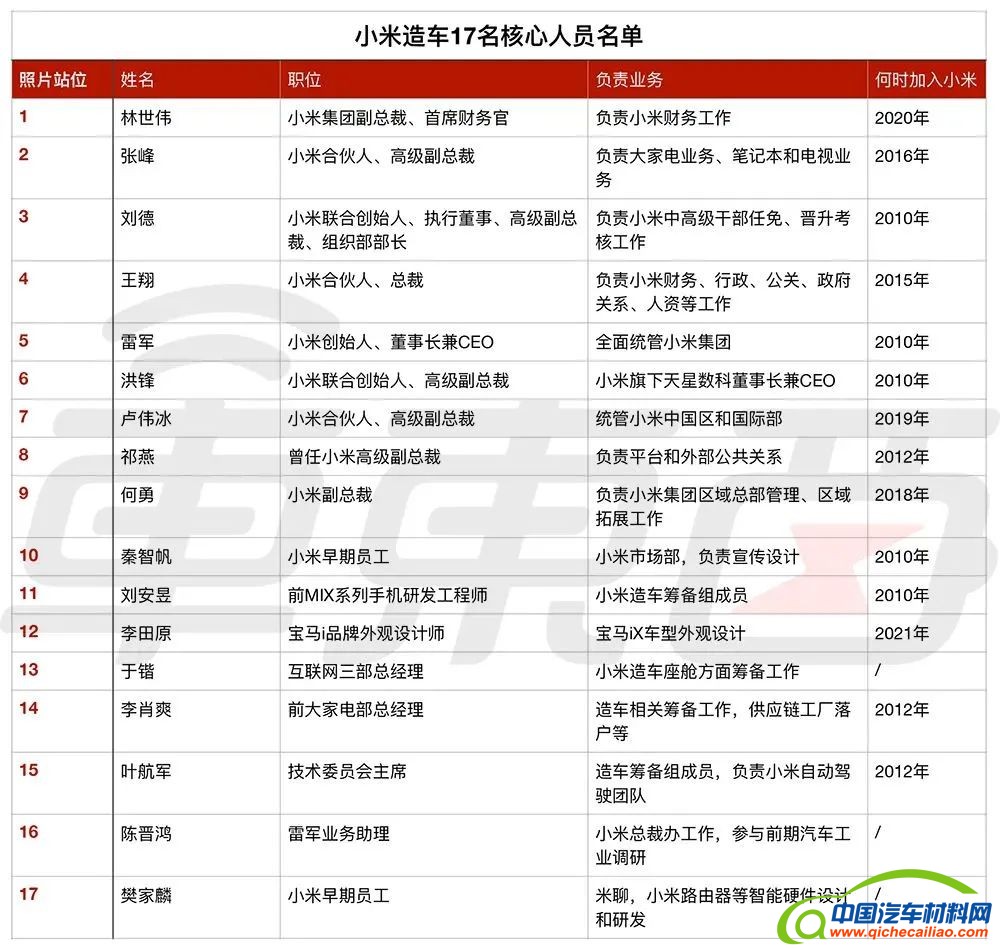 揭秘小米汽车17人核心团队