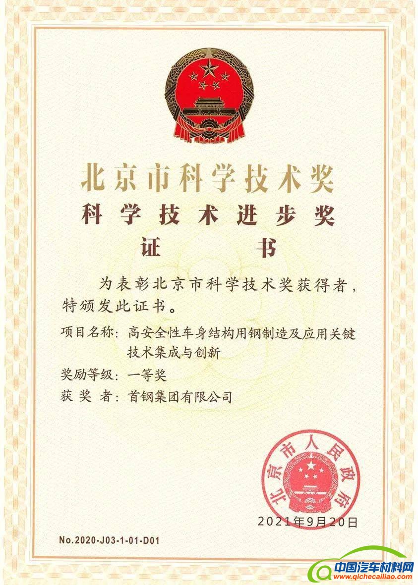 近日,经北京市人民政府批准,2020年度北京市科学技术奖获奖名单正式公布。由首钢集团牵头完成的《高安全性车身结构用钢制造及应用关键技术集成与创新》项目荣获科学技术进步奖一等奖。