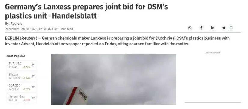【汽车材料网】据德国《商报》近日消息,援引知情人士透露,德国化学品供应商朗盛目前正着手联合投资方Advent竞购化工巨头帝斯曼DSM,主要收购对象为其塑料业务板块。