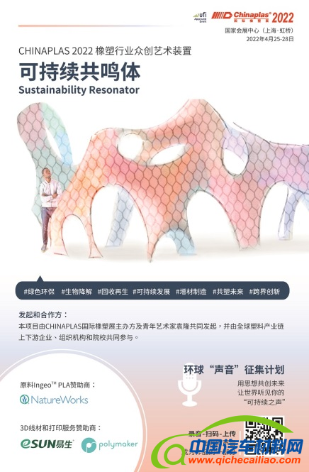 项目由“CHINAPLAS国际橡塑展”主办方和青年艺术家袁隆共同发起,全球产业链上下游企业、组织机构和院校共同参与。活动旨在传递出“绿色环保、回收再生、共塑未来、增材制造、跨界创新、生物降解、可持续发展”的关键信息,推动全行业、全社会、全人类共同关注塑料回收科技,关注环保和可持续发展。立即按这里或扫描图片中的二维码,向世界发出你的“可持续之声”。