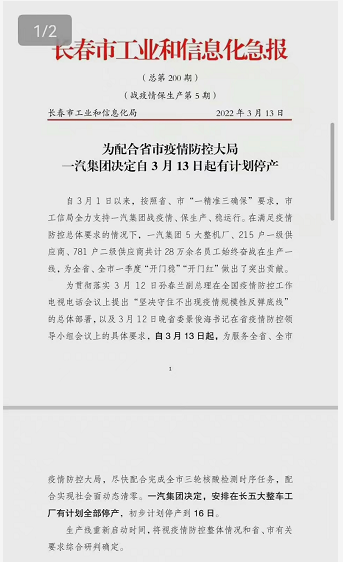 【汽车材料网】3月13日消息,因受长春疫情影响,一汽集团在内部通知自3月13日起,安排在长春的五大整车工厂有计划全部停产,初步计划停产到16日。生产线重新启动时间将视疫情防控整体情况和省、市有关要求综合研判确定。