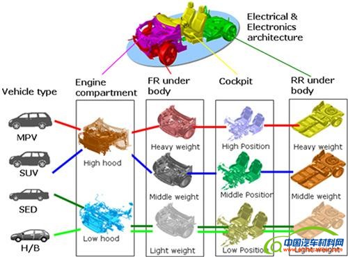 按照细分市场划分,CMF衍生的轿车和混合动力轿车/电动轿车在发动机舱方面都将采用低发动机罩布局,前后底盘均为轻型,座舱设计为低位。MPV和SUV车型发动机舱都将发动机罩设为高位格局,SUV应用中型前后底盘,以及中位设计座舱;MPV则进一步将底盘重型化,座舱位置也是各类车中最高者。