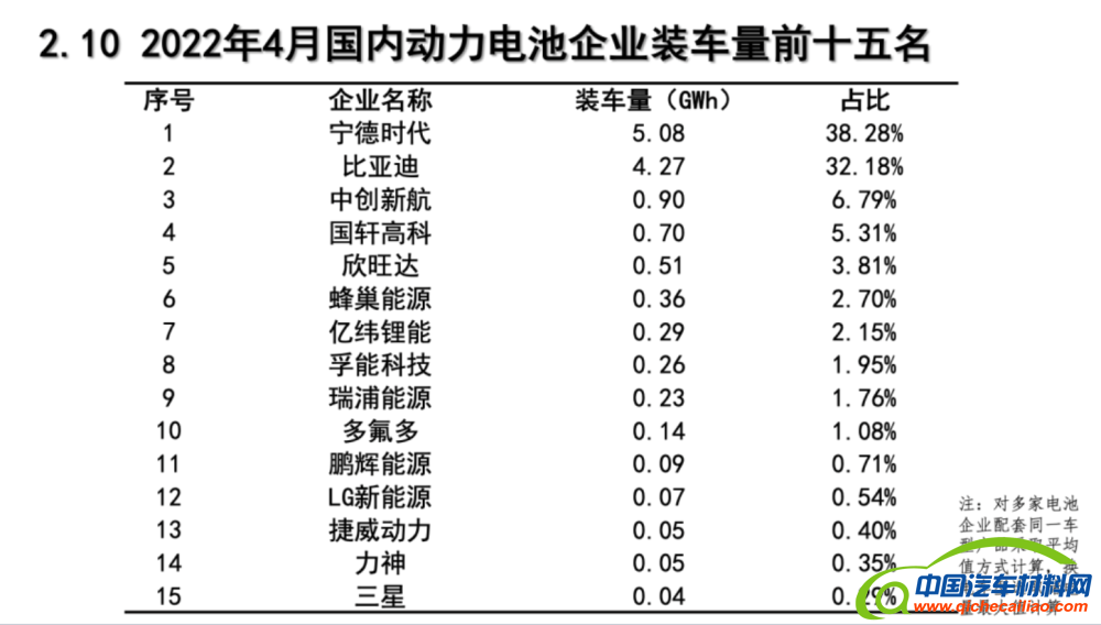值得关注的是,前十的动力电池厂商的装机量占比出现了不小的变化,其中作为龙头企业的宁德时代市占率跌破40%降至38.28%,比起3月份50.49%的市占率有12.21个百分点的下降。而常居第二名的比亚迪的装机量占比从3月的19.24%增长至32.18%,拉近了和宁德时代的距离。