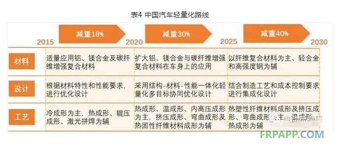 到 2030 年以纤维复合材料为主、轻合金和高强度钢为辅,结合制造工艺和成本控制要求进行集成化设计,以热塑性纤维增强复合材料成型及挤压成型、弯曲成型为主,温成型、热成型为辅。
