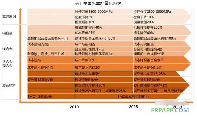 美国汽车轻量化路线,以材料进步为驱动,综合衡量材料成本、性能、可回收性及用量。