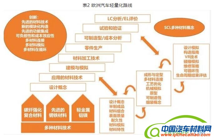 欧洲汽车轻量化路线,以先进的钢铁材料、轻金属镁铝、碳纤维复合材料三类先进轻量化材料应用为出发点,目标瞄准多材料应用技术。