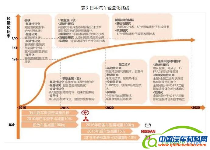日本汽车轻量化路线,以材料和工艺的基础研究突破为实用化出发点,材料进步驱动轻量化。