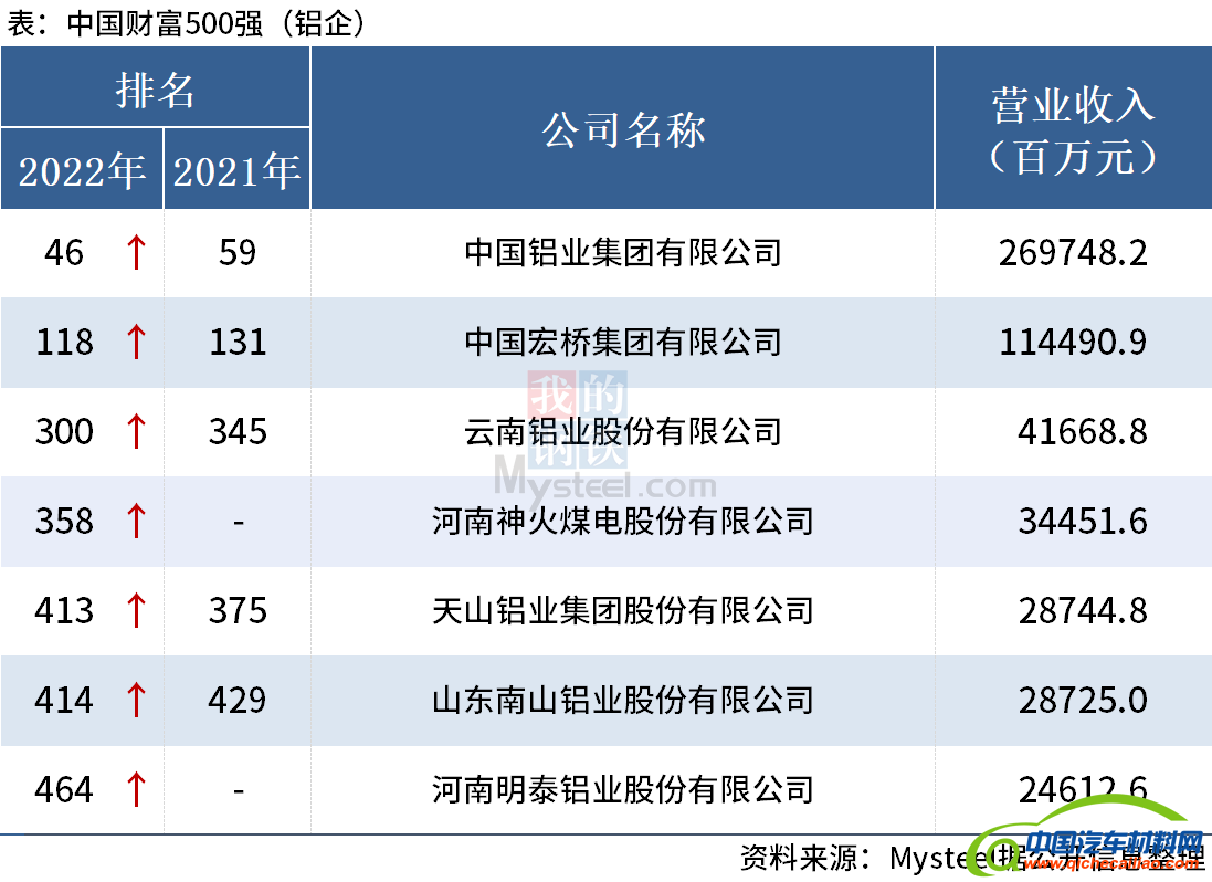 【汽车材料网】 7月13日,2022年财富中国500强榜单发布。据统计,铝行业上榜企业共有7家。其中,排名前三的铝企业为,中国铝业集团有限公司、中国宏桥集团有限公司和云南铝业股份有限公司,500强的排名分别是46名、118名和300名。