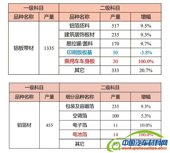 铝板带材表现突出,去年产量约为1335万吨,除印刷版板基略有下降外,铝箔坯料、建筑装饰板材、易拉罐盖料等均有近10%的产量增幅,乘用车车身板产量增幅为100%,达到30万吨。铝箔体量虽相对较小,但产量增幅明显,其中电池箔产量达到14万吨,增幅为100%。