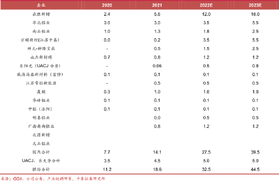 伴随着新能源汽车等需求的高景气度,下游电池厂的大规模产能规划,不少铝箔企业开始关注到动力电池铝箔领域,但受限于投产周期(一般为 2-3 年)和 Know-how 工艺等影响,2022 年能够批量稳定供应的企业仍然主要集中在鼎胜新材、万顺新材、南山铝业、神火股份和华北铝业等几家公司。中泰证券预计 2022-2023 锂电铝箔产量分别为 32.5 和 44.5 万吨,对应的供需缺口为-0.2 和 0.0万吨,行业紧平衡的状态有望延续。