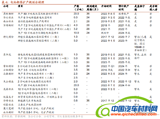尽管电池铝箔行业壁垒高、投产周期长,国内众多铝加工企业及电解铝公司均公告进军电池铝箔。招商证券梳理的国内电池铝箔项目合计产能107.4万吨/年,项目概况及时间规划如下:
