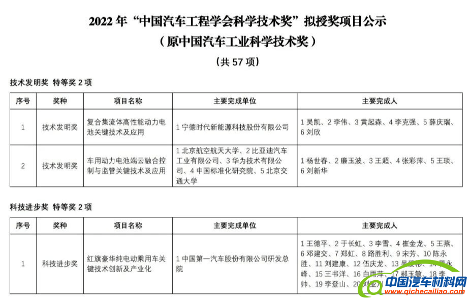 2022年“中国汽车工程学会科学技术奖”终评会于9月28-29日在北京成功召开。根据《中国汽车工程学会科学技术奖励办法》规定,经中国汽车工程学会科学技术奖评审委员会评审,共评出技术发明奖特等奖2项、科技进步奖特等奖2项、技术发明奖一等奖1项、科技进步奖一等奖7项,科技进步奖二等奖13项,科技进步奖三等奖32项,累计拟授奖项目57项;拟授中国汽车工程学会优秀科技人才奖5人、中国汽车工程学会优秀青年科技人才奖4人。