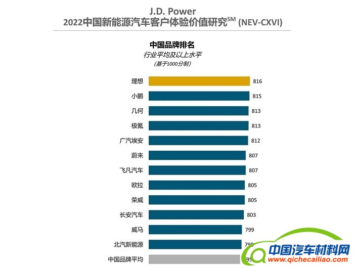 具体排名上,中国品牌方面,理想以816分排名中国品牌细分市场新能源汽车客户体验价值第一。小鹏(815分)排名第二,几何(813分)以及极氪(813分)并列第三。
