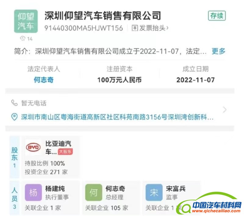 据了解,深圳仰望汽车销售有限公司于今年11月7日注册成立,公司为比亚迪100%持有。而在11月8日晚,上游新闻记者从比亚迪官方获悉,比亚迪正式为该高端品牌命名——仰望,并确认旗下车型将从80万元起。