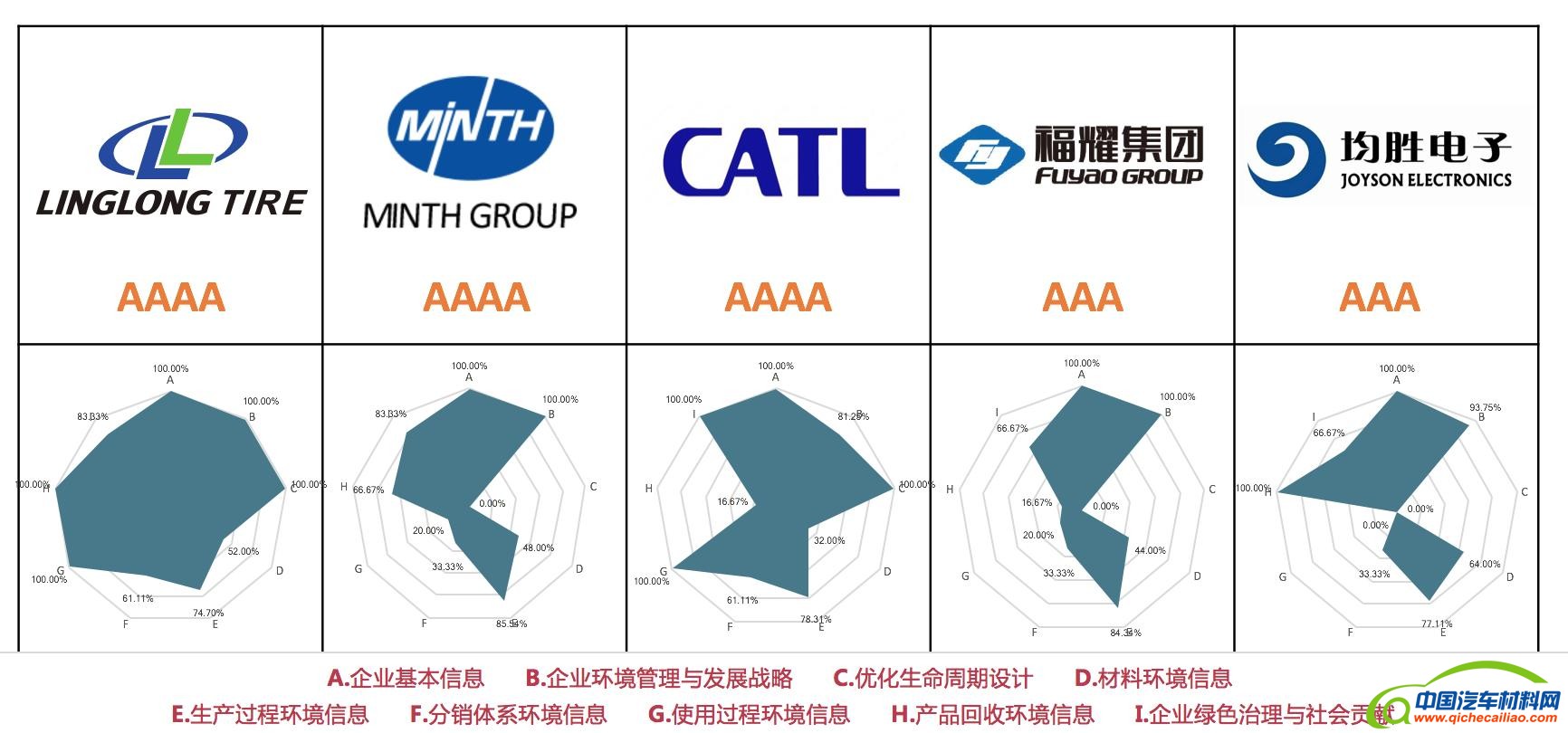 零部件企业中,玲珑轮胎、敏实集团、宁德时代3家获得AAAA评级;福耀集团、均胜电子获得AAA评级,均位居前列。这些企业通过对绿色发展信息公开,成为绿色信息披露行业标杆。