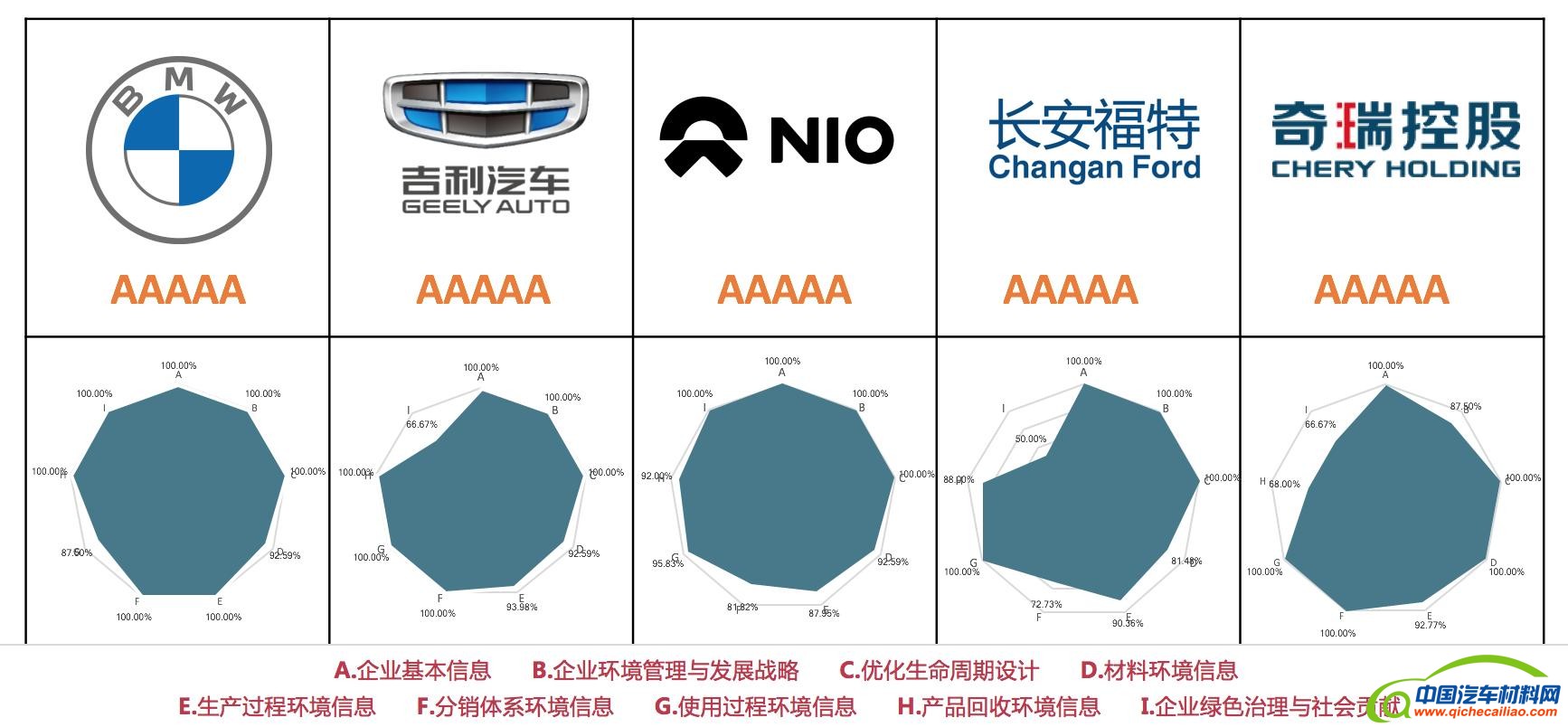 本次会议中,中汽数据发布了2022年汽车及零部件企业绿色发展指数(GDI)排名。本年度核算了47家主流汽车企业及108家零部件企业,核算结果显示,5家汽车企业获得汽车行业绿色发展指数(GDI)AAAAA评级,分别为华晨宝马、吉利汽车、蔚来汽车、长安福特、奇瑞集团。