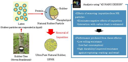 而现在,住友公司通过利用“4D NANO DESIGN”材料技术对其天然橡胶材料进行研究发现,通过提高天然橡胶的纯度不仅能够提高橡胶分子与炭黑的键合力提高轮胎耐磨耐久性,而且能够加强橡胶与炭黑之间的相互作用提高燃油经济性,从而影响炭黑在橡胶材料微观上的分布情况。然而,提高天然橡胶的纯度也会产生一定不利影响,天然橡胶含有一定的杂质可以有效避免在橡胶加工过程中受热腐败,正因为天然橡胶纯度增加,杂质减少,这使得橡胶在受热情况下更有可能腐败受损。
