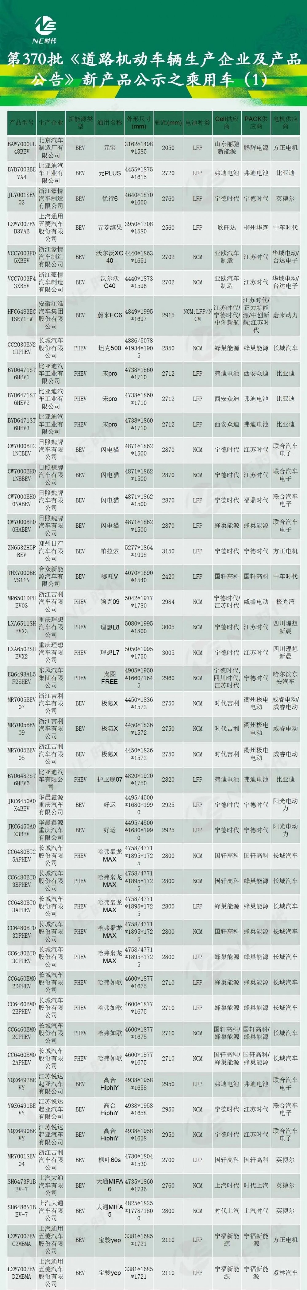 本批次申报车型中,轿车24款,SUV车型37款;BEV车型49款,PHEV车型12款;32款搭载LFP电池,29款搭载三元锂电池。