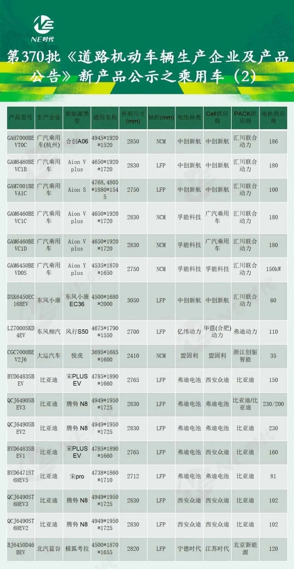 电池供应商中,中创新航供应9款车型,时代上汽11款,宁德时代11款,蜂巢能源供应7款,弗迪电池供应7款,瑞浦首次供应奔腾NAT,与一汽的供应关系由此正式建立,随着腾势新车型的推出,弗迪电池供应版图也对应扩大,蜂巢能源在本批次中正式开始供应五菱荣光EV,孚能科技继续供应广汽,本批次供应车型为Aion Y Plus和Aion V Plus,欣旺达首次供应江铃新能源易至EV2,东风柳汽新引进电池供应商亿纬动力,赛力斯初次与赣锋锂电建立电芯供应关系。