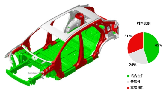 《节能与新能源汽车技术路线图2.0》明确指出,多材料混合应用是我国今后汽车轻量化发展的主要方向。本项目创新采用“上钢下铝”车身结构设计,即上车体钢制结构(高强度钢占白车身比例31%)+下车体铝制结构(铝合金占白车身比例45%),成功实现了整车重量下降、刚度上升、续航增加、成本降低、安全加强等一系列创新成果。