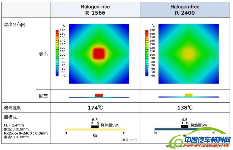 凭借公司独特的树脂设计及混合技术,实现材料的高耐热化。可承受功率半导体的发热,在车载等高温环境下使用。另外,还可与公司无卤环氧玻璃多层基板材料R-3566D(UL额定温度150℃取得)同时使用。
