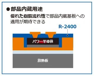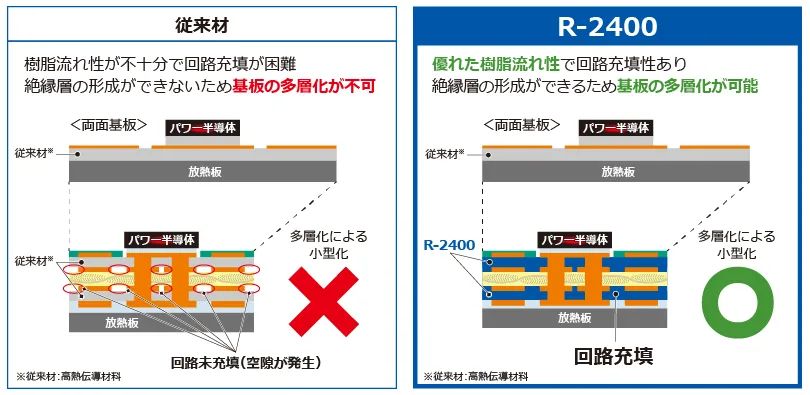 通过采用无机填料设计(一种涉及具有热传导性无机填料(填充剂)的种类及填充量、以及与有机树脂混合方法的技术,是提高材料导热率必不可少的技术)专有技术的高热传导技术,使电子电路基板整体的散热性提升,并有助于缓解功率半导体的发热。由此还可以减少散热片及冷却风扇等热对策零部件数量,从而帮助实现设备的小型化。