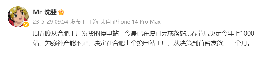 沈斐表示,为实现 2023 年新增 1000 座换电站的目标,弥补产能不足,蔚来决定在合肥设立换电站工厂,新工厂从决策到首台发货耗时三个月。