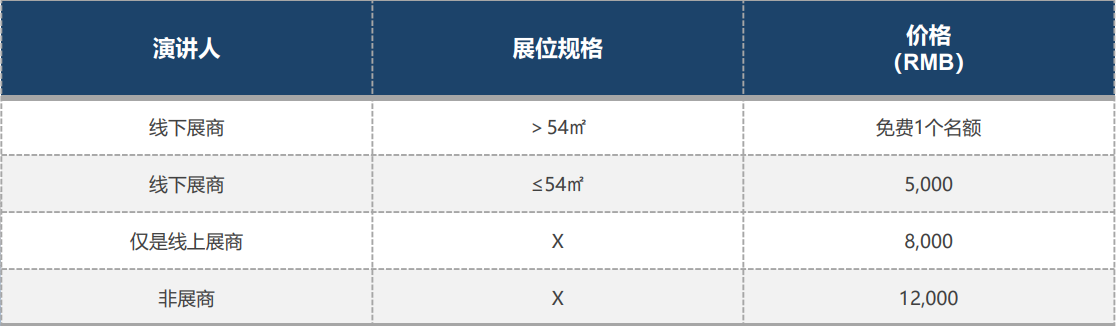不符合免费邀请条件的个人、单位、展商,请按 5,000-12,000 元/场/30分钟付费。