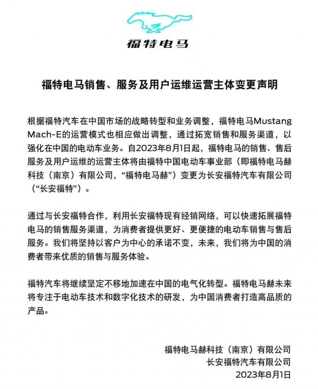 也就是说,自 8 月 1 日起,福特电马的销售、售后服务及用户运维的运营主体将由福特电马赫科技(南京)有限公司(下称 " 福特电马赫 ")变更为长安福特汽车有限公司(下称 " 长安福特 ")。