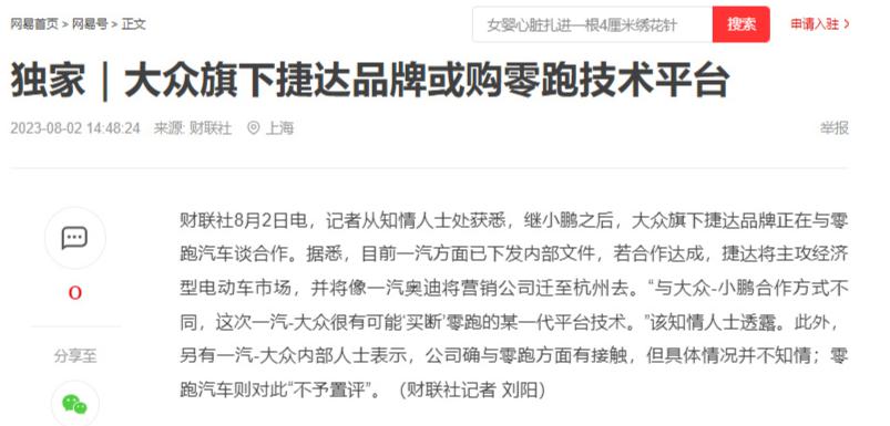 【汽车材料网】继小鹏与大众签署合作造车协议后,大众旗下的捷达被传或购零跑技术平台来主攻经济车。