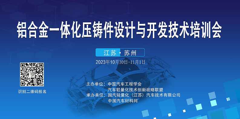 为了更好地搭建行业专业技术交流平台,由中国汽车工程学会(以下简称:中汽学会)、汽车轻量化技术创新战略联盟(以下简称:轻量化联盟)主办,国汽轻量化(江苏)汽车技术有限公司(以下简称:国汽轻量化)、中国汽车材料网(以下简称:汽车材料网)联合承办的“铝合金一体化压铸件设计与开发技术培训会”将于2023年10月30日-11月1日召开。培训会将以汽车开发者和工程制造者的产品设计和开发需求为视角,通过案例分析以及重点技术解读等形式共同探讨新技术在工程化应用中面临的问题及解决方案。