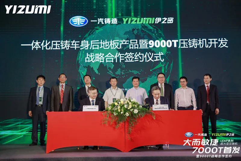 2022年5月26日,一汽铸造有限公司(简称:一汽铸造)与伊之密股份有限公司举行一体化压铸车身后地板产品暨9000T压铸机开发战略合作签约仪式。一汽铸造计划引进伊之密LEAP系列9000T超大型压铸机。